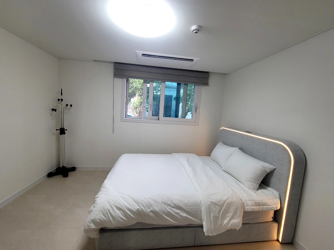 방에는 큰 침대와 화장대가 있고 다른 방은 토퍼로 되어 있었어요.